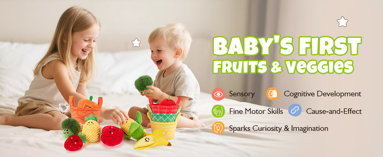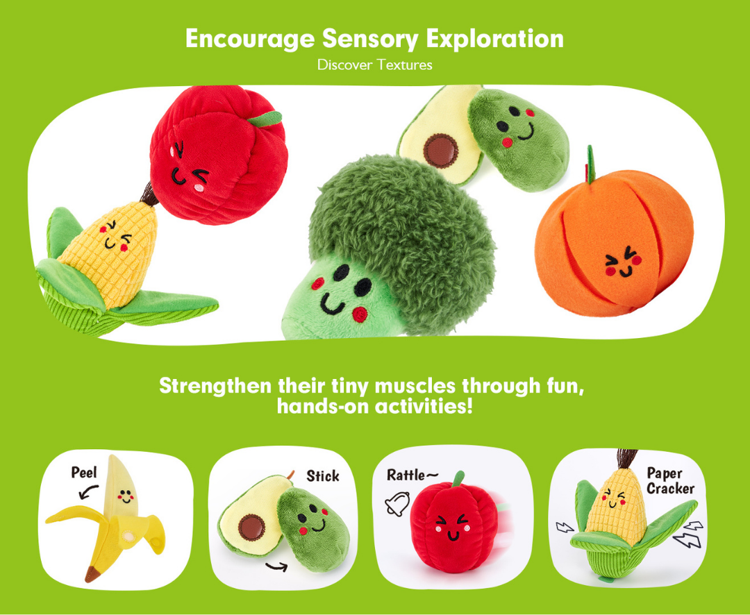 Give your little one a joyful way to explore colors, textures, and sounds. Each plush fruit and veggie invites hands-on discovery that strengthens fine-motor skills, encourages sensory development, and builds confidence through independent play.
